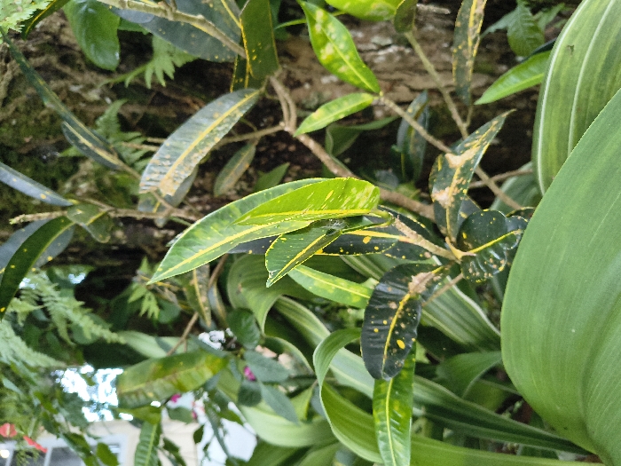 The scene depicts a dense array of tropical foliage within a garden environment in the city of Unknown, Vietnam. A large, solid green leaf occupies the lower foreground, partially obscuring a croton plant (Codiaeum variegatum) displaying numerous green leaves with distinct yellow and brown variegation, including speckles and stripes. Behind these plants, a textured brown tree trunk is partially visible, interspersed with further green, possibly fern-like, vegetation. A light-colored structural element and a faint red object are visible in the blurred upper left background. The lighting suggests natural daylight conditions. No individuals, explicit actions, or interactions are present.