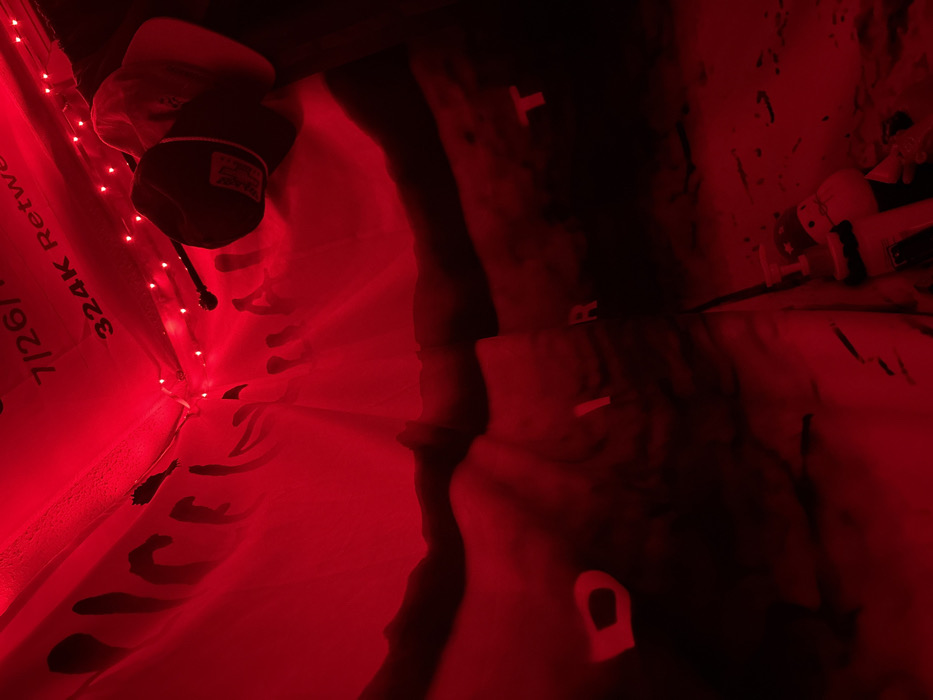 A scene awash in intense red light. A white surface with black, handwritten markings is visible, along with faint red string lights. A black object with a white label, possibly a bottle, is perched above. In the dim portion, indistinct shapes are present, including what appears to be a white object and clothing with a white "R" and a looped shape, perhaps a drawstring. Overall, the composition is unclear due to the strong, monochromatic lighting.