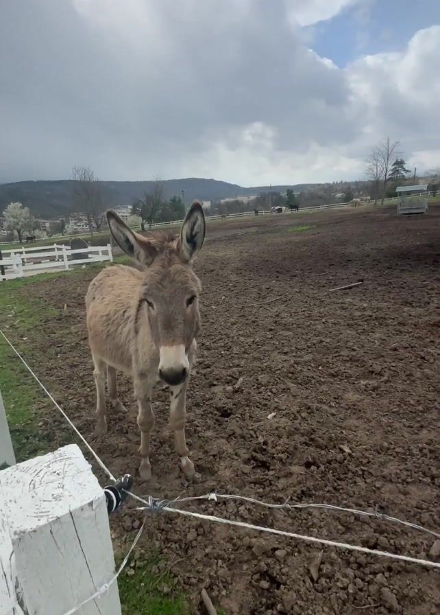 donkey in a muddy enclosure. The donkey is light brown with a white nose and has large ears. It stands near a white fence with an electric wire running along it. The ground is muddy, and there is some green grass growing near the fence. In the background, there are trees, a small white building, and a few other horses in the distance. The sky is cloudy. The camera moves closer to the donkey's face, providing a detailed view of its eyes, nose, and fur.