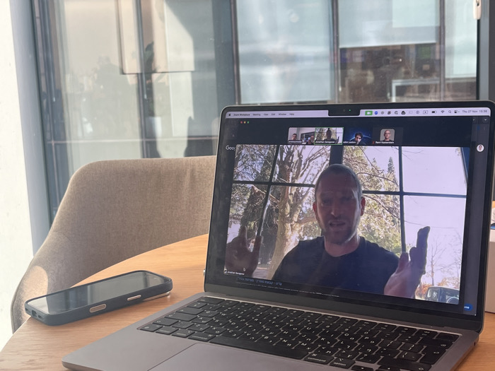 An indoor scene displays a silver Apple MacBook laptop on a light wooden table. The laptop screen features an active Zoom video conference. The central speaker is a man with short, light hair and a beard, wearing a black t-shirt, actively gesturing with both hands as he speaks. His video feed background shows an outdoor setting with trees and a vehicle, viewed through a window grid. Above him, a gallery view shows smaller participant windows, including "Jonathan Sang" and "Karn Kasztan" with active video, and "Iddo Yiz". The macOS menu bar displays "Thu 27 Nov 15:38". The laptop's keyboard has Hebrew characters. To the left of the laptop, a dark-colored smartphone in a case lies face down on the table. A light-colored upholstered chair is visible behind these items, adjacent to a large window. The window reflects elements of the interior and provides a blurred view of an urban environment. Based on the Hebrew keyboard and names visible within the video conference, the scene is located in Tel Aviv, Israel.