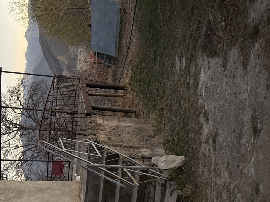 The image depicts an outdoor scene in Vaghatin, Armenia, presenting a partially constructed or weathered residential environment with mountainous background. In the foreground, a concrete staircase with a white, angular metal railing ascends towards the left, leading to a concrete landing. A white plastic bag is crumpled at the base of the stairs. To the right of the stairs, an elevated, dark brown metal balcony structure with an ornate railing extends from the main building, supported by three visible vertical metal poles. A red fabric item is draped over the balcony railing, and a white plastic bucket is positioned on the balcony's surface. The immediate ground level is a mixture of dry, patchy grass and dirt pathways. A dark hose or cable runs horizontally across the mid-ground. In the middle distance, to the right, a light-grey rectangular concrete slab leans against a wooden framework; a small, dark object rests on its top edge. The background features rolling hills with sparse, bare deciduous trees, and in the far distance, snow-capped mountains are visible under a pale, clear sky, indicative of early morning or late afternoon light. No individuals are present in the scene.