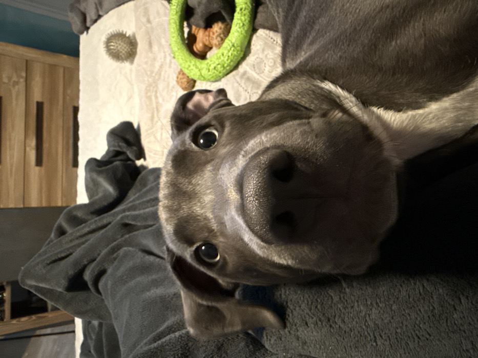 - "An indoor scene features a blue-nosed pit bull type dog, gray in coloration with lighter markings on its chest, lying on a bed and looking directly at the camera" by FM-NMkt72, licensed under CC BY 4.0