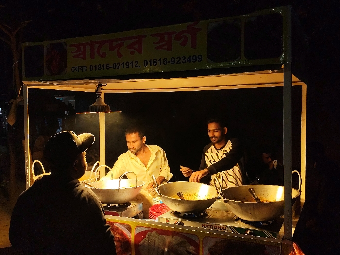 The scene depicts a nighttime street food stall operating in Dhaka, Bangladesh