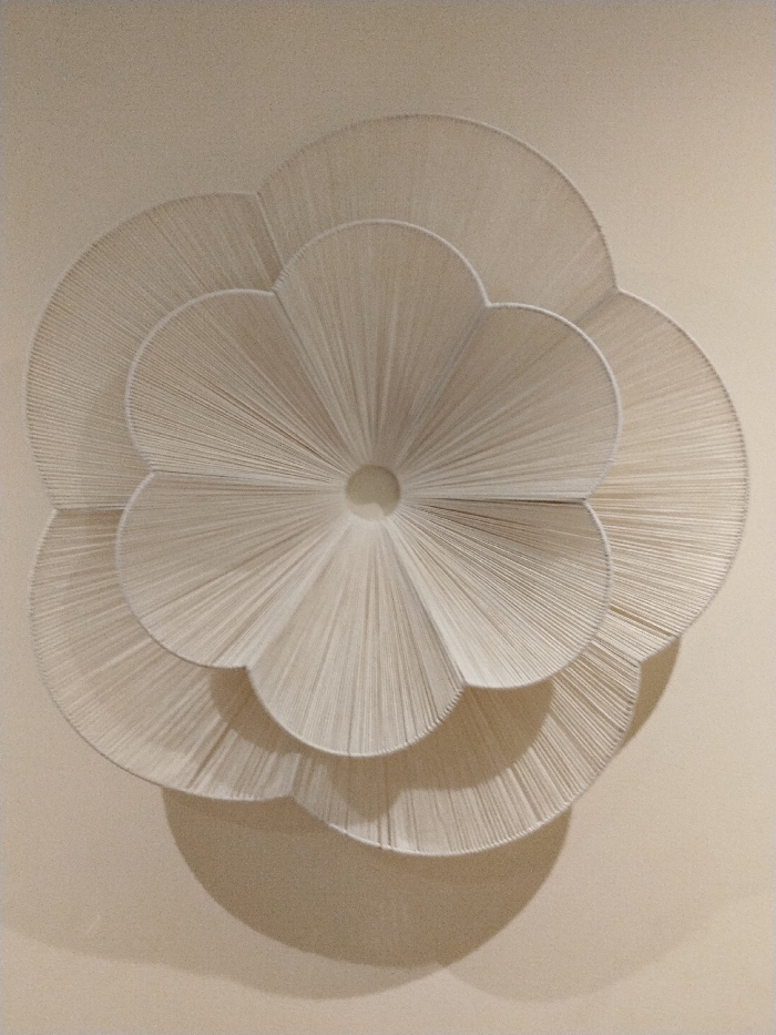 The image depicts a three-dimensional, wall-mounted art piece against a plain, light beige wall. The artwork is constructed from fine, tautly stretched white or off-white thread or string, forming a large, stylized multi-layered floral design. It features a central circular aperture from which threads radiate outwards, defining multiple concentric, rounded, petal-like segments. Three distinct layers of these segments are visible, with the innermost layer being the smallest. Each segment is composed of numerous parallel threads. Illumination appears to originate from the upper left, casting a prominent, crescent-shaped shadow on the wall below and to the right of the artwork, emphasizing its dimensionality. No individuals or additional objects are visible. The specific location within Vila Real, Portugal, cannot be identified from the visual evidence.