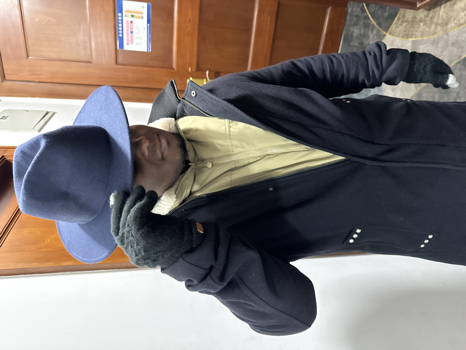 In the Daxing District, China, an adult male is depicted from the waist up in an indoor setting. He wears a dark navy blue felt fedora-style hat, held by his gloved left hand, partially obscuring his face. His visible features include dark skin and a goatee. He is dressed in a dark, open, long winter coat with a cream-colored faux-shearling collar, worn over a beige or khaki quilted puffer jacket that is zipped. Both hands are covered with black knit gloves; the left glove has a small brown tag near the cuff, and the right glove features white fingertips. The background consists of light-colored walls and two dark wooden doors. An electrical box is mounted above the right door, which also displays a blue and white informational poster with Chinese script and graphics. A patterned floor is visible in the lower right.