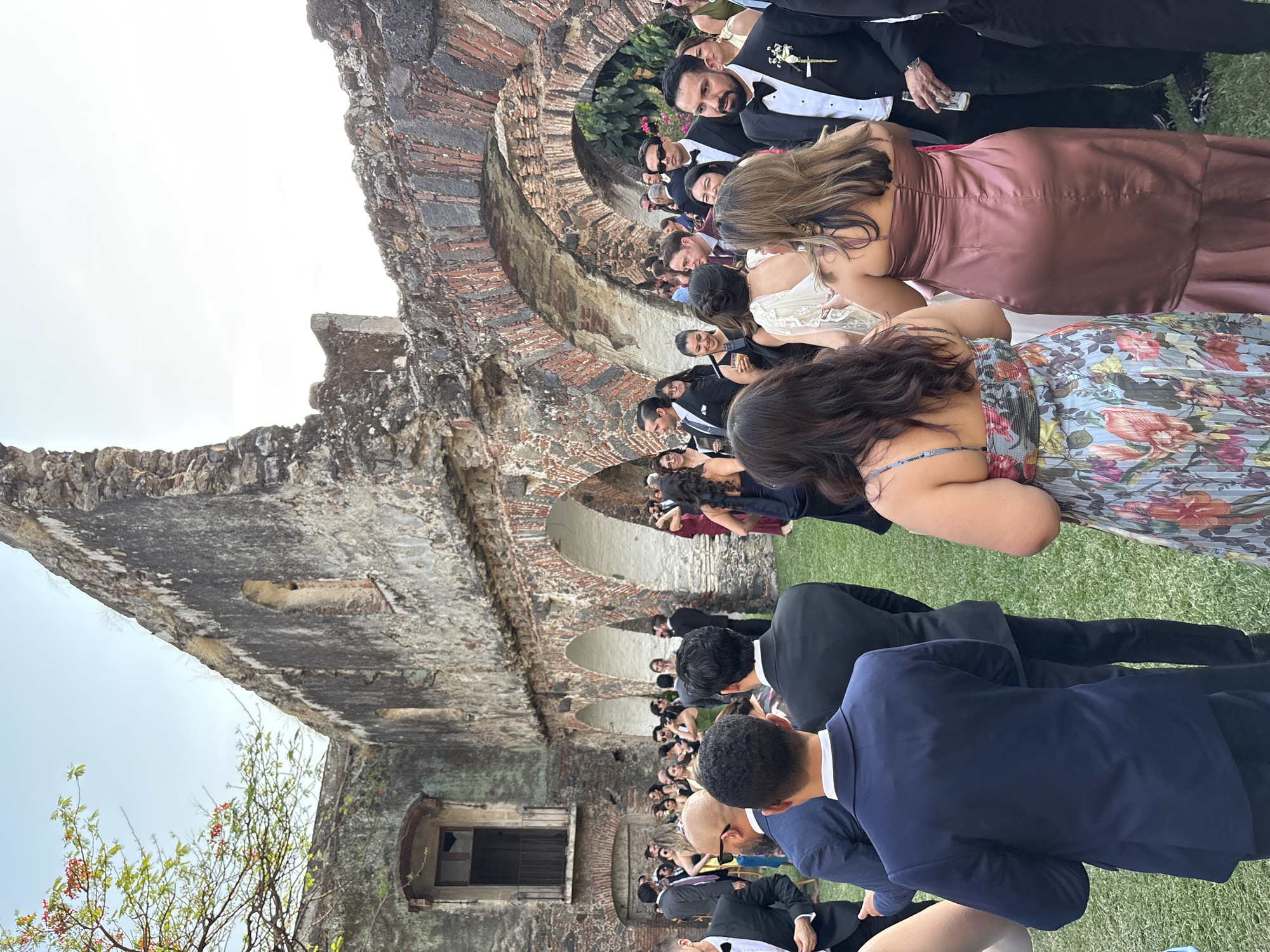 gathering of people, likely attending a wedding, within the ruins of an old structure. The structure features weathered stone and brick archways. The people are dressed in formal attire. The event is taking place outdoors on a green lawn. The location is not Progreso, Mexico.