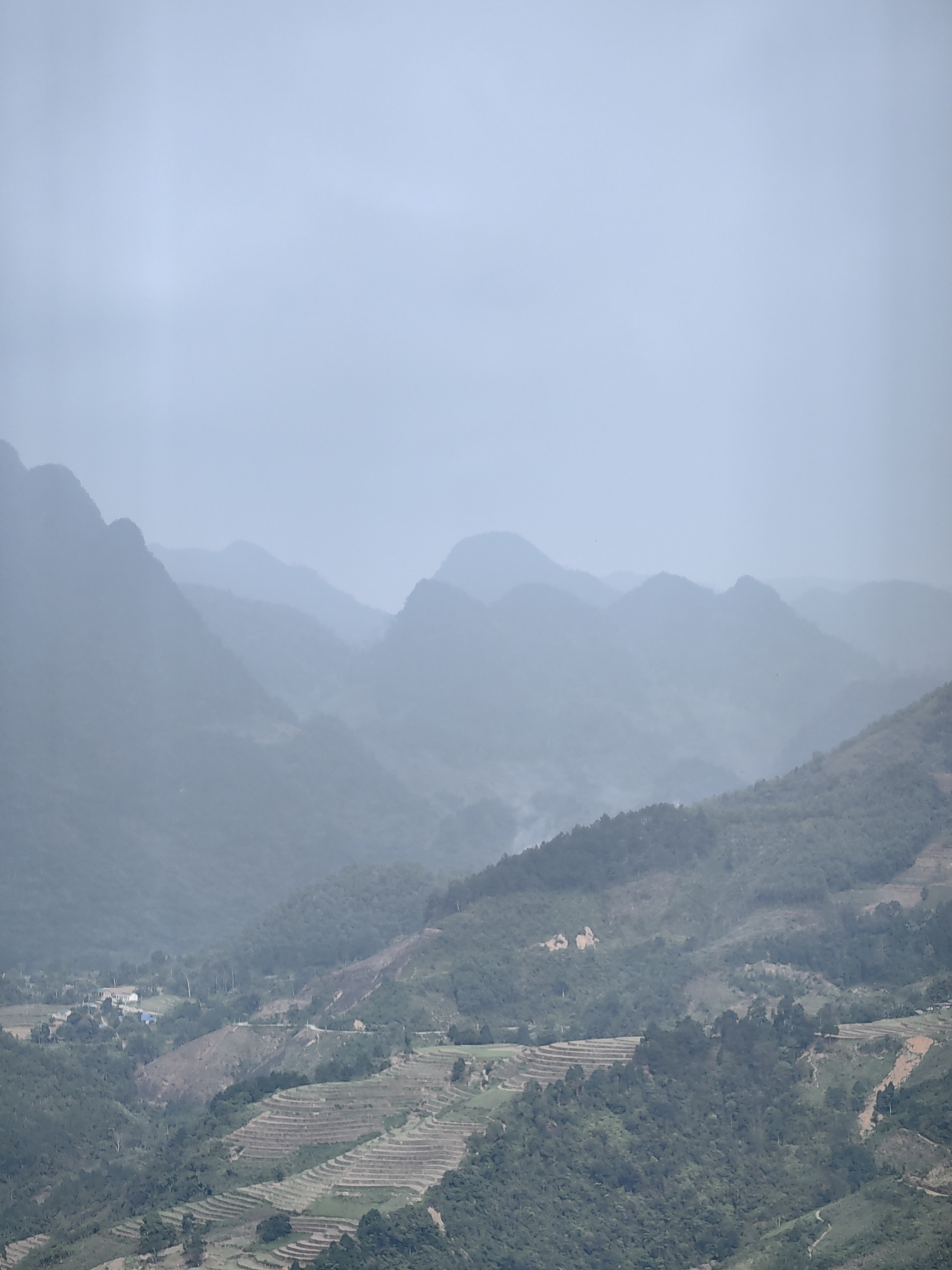 The image depicts a mountainous landscape in Thuận Hòa Commune, Vietnam, shrouded in haze. Multiple mountain ranges recede into the distance, their shapes indistinct due to the atmospheric conditions. In the foreground, terraced fields are visible on the slopes, a testament to agricultural activity in the area. Patches of cleared land or erosion are interspersed with forested areas. In the lower left, a small settlement with buildings is discernible. The sky is overcast, contributing to the overall muted and diffused lighting of the scene.