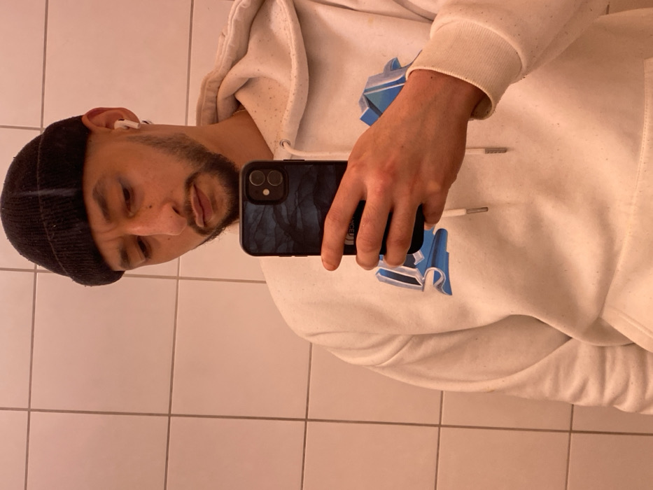 A person in a white hooded sweatshirt and black beanie holds a phone taking a selfie in a bathroom. The phone case has a dark, textured design resembling trees. The hoodie features a blue and white graphic. The person has a short beard and is wearing an earpiece. The background consists of white, square bathroom tiles. The image is rotated ninety degrees.
