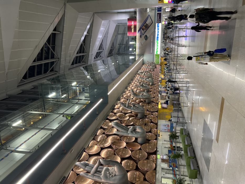 The image depicts the interior of a modern airport terminal, specifically Terminal 3 of Indira Gandhi International Airport in New Delhi, India