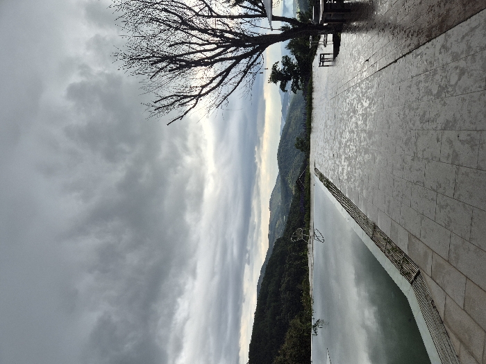 The image depicts an outdoor elevated area in Thôn 5, Vietnam, under an overcast sky. In the left foreground, an infinity-edge swimming pool reflects the grey sky and distant mountains. Adjacent to the pool's edge, a light-colored tiled patio extends towards the right, appearing wet with standing water and reflections, indicating recent rainfall. This tiled area transitions to a darker, wet wooden deck on the far right. A prominent, leafless deciduous tree with dark branches, possibly adorned with string lights, stands on the right side of the patio. Beneath this tree, a dark wooden outdoor table and stools are visible, alongside a partially open white outdoor umbrella. The background features a panoramic view of successive ranges of mountains and hills covered in dense green vegetation, extending to the horizon under a heavily clouded sky. No individuals or active subjects are present in the scene.