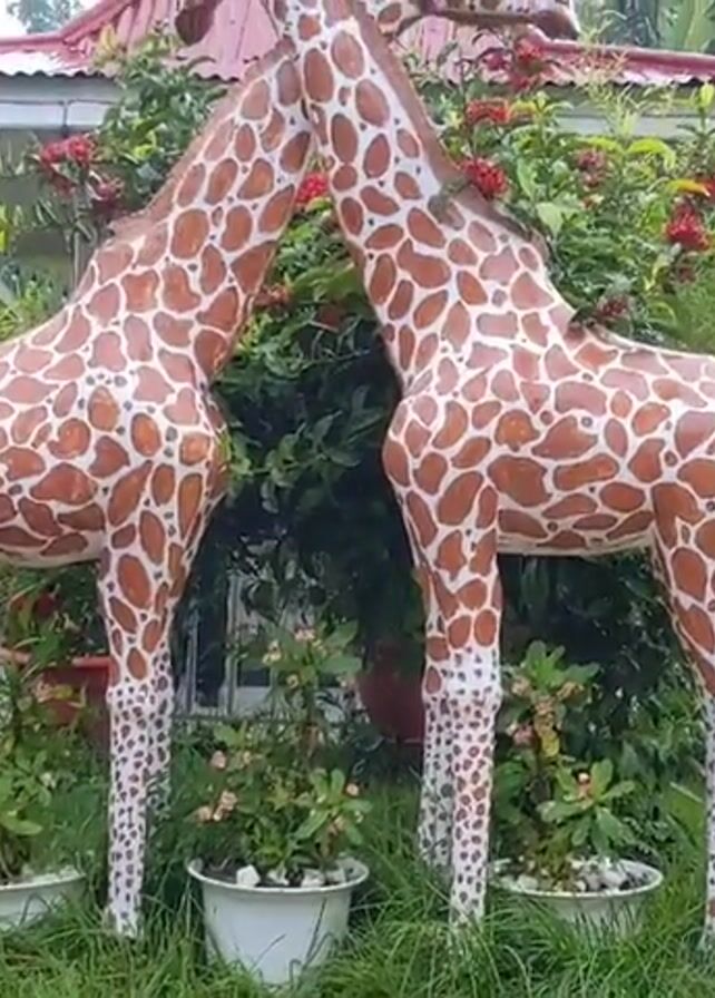 Here's a plain text description of the video: The video showcases two giraffe statues in a garden setting