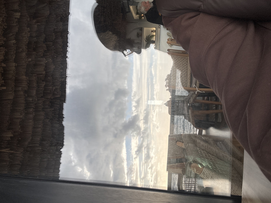 The image depicts a scene observed from inside an establishment in Petrovac na Moru, Montenegro, looking out through a large glass window. In the lower right foreground, a brown upholstered surface is partially visible. The window's surface reflects a prominent thatched ceiling overhead, the profile of an individual wearing eyeglasses, and the upper torso of an older male with white hair and a beard, seated indoors further to the right. Beyond the window, an outdoor seating area with several wicker chairs and wooden tables is arranged. The background consists of the sea, exhibiting moderate wave activity, under an overcast sky with varied cloud formations. In the mid-distance, a small island or rock formation is visible, crowned by a slender white structure, identified as a lighthouse.
