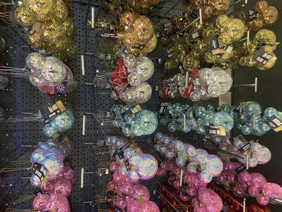 The image depicts a retail merchandise display in Mouscron, Belgium, showcasing numerous Disney-themed Christmas ornaments. The ornaments are shaped like Mickey Mouse heads, constructed from small, reflective mirrored tiles, resembling disco balls. They are arranged in vertical columns by color, featuring shades of pink, iridescent light blue, aqua, silver, and gold. Each ornament is suspended by a metal hook from a dark grey pegboard wall. Multiple product tags, some white with black lettering and others red, are attached to various ornaments. The scene is static, devoid of people or discernible actions.