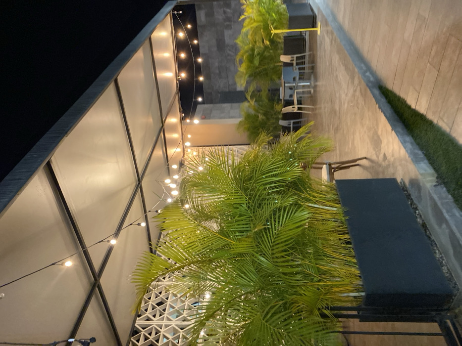 An outdoor space is lit by string lights hanging from a building's angled roof structure. Green palm trees decorate the patio, adjacent to seating areas with tables and chairs. A decorative wall is present to the left side. A strip of artificial turf runs along the right side of the walkway. The scene gives off an ambient, modern, and relaxed atmosphere.