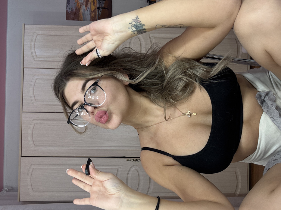 An indoor, chest-up portrait shows a young adult female posing in what appears to be a residence in Chaikovsky, Russia. She has light brown hair with blonde highlights and wears round, black and clear-framed eyeglasses. Her lips are pursed, and she looks directly at the camera. She wears a black spaghetti strap bra top, a gold-colored necklace with a multi-toned cross pendant, and light-colored shorts with grey lace trim. A black elastic is on her left wrist, and a multi-banded ring is on her right ring finger. Her left hand is raised, holding a small, black, oblong object between her thumb and index finger. Her right hand is also raised, with splayed fingers near her head. The background features a light wood-toned three-door wardrobe with gold-colored handles. Above the right side of the wardrobe, a small framed painting depicts a sunset or sunrise beach scene with figures, set against a light pink wall.