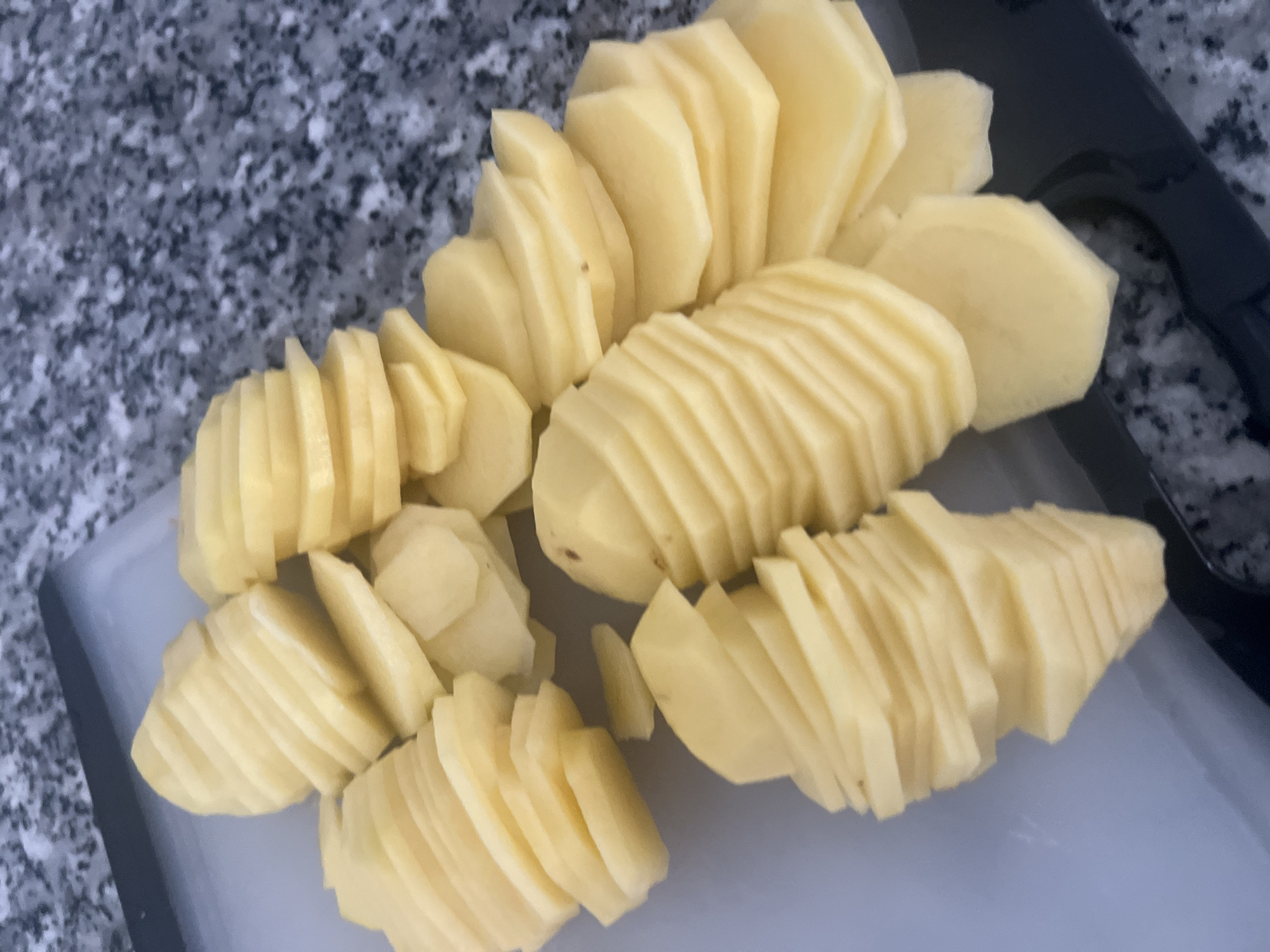 - "The image displays a close-up, elevated view of numerous thin slices of raw, peeled potatoes" by FM-gZMgt2, licensed under CC BY 4.0