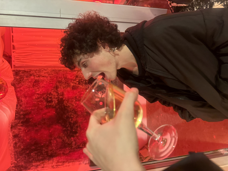 A person in a black jacket with curly hair and a star earring tilts their head back, opening their mouth to receive a stream of wine from a wine glass. The glass is held by another person's hand. A room with red lighting is visible in the background, along with a disco ball and a white object that appears to be a curtain. The scene has a tilted perspective.