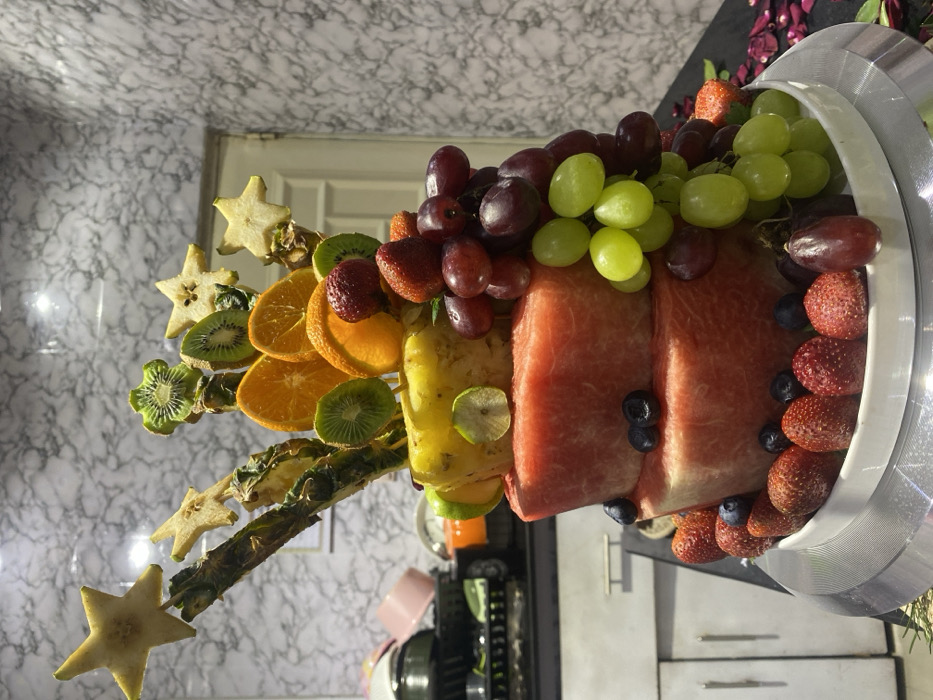 A multi-tiered fruit display, resembling a cake, is centrally positioned on a silver-colored rotating cake stand with a white plate