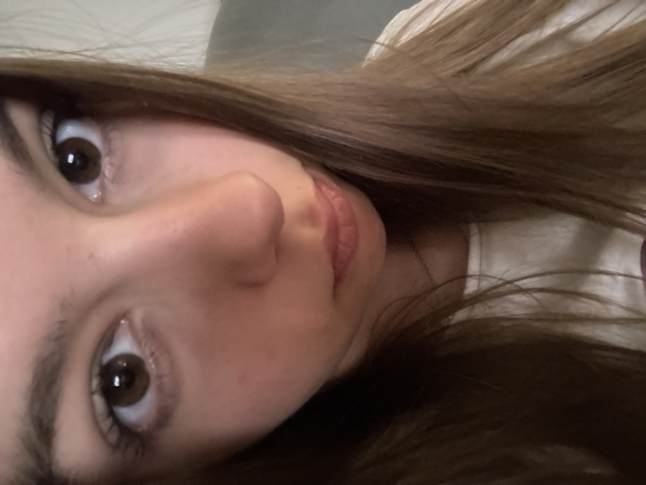 A tightly cropped, high-angle portrait captures a female individual, located in Plovdiv, Bulgaria. Her face dominates the frame, presenting wide-open brown eyes, prominent dark brown eyebrows, and a central nose due to the close perspective. Her lips are closed, displaying a natural pink tone. Long, straight, light brown hair frames her face and flows over her shoulders. She is dressed in a light-colored, crew-neck garment, and a thin, metallic chain necklace is visible around her neck. The background is significantly blurred, indicating a shallow depth of field, and shows indistinct light and dark surfaces, consistent with an indoor setting. No other individuals, specific objects, or defining environmental features are discernible beyond the subject and her attire.