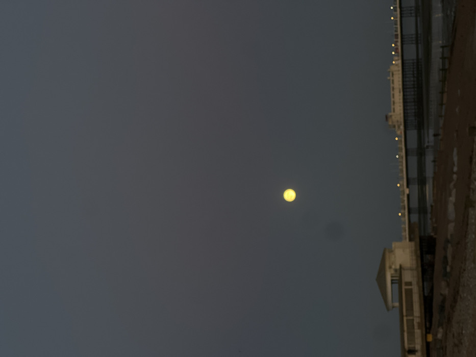 This image depicts Worthing Pier in Worthing, United Kingdom, at dusk or night. A prominent, bright yellow moon is visible in the upper-middle portion of the dark grey sky. The pier extends from the left side of the frame into the background, showcasing its architectural structures. A multi-story, light-colored pavilion with a pitched roof is visible at the shore end of the pier on the left. The main length of the pier is illuminated by a series of small, artificial yellow lights along its railing, which cast faint reflections on the wet foreshore below. The foreground consists of a dark, rocky and sandy beach, indicating a low tide, with several indistinct human figures walking on the exposed wet sand beneath the pier structure. The overall environment is calm, with a clear sky allowing visibility of the moon and artificial lights providing illumination to the pier and its immediate surroundings.