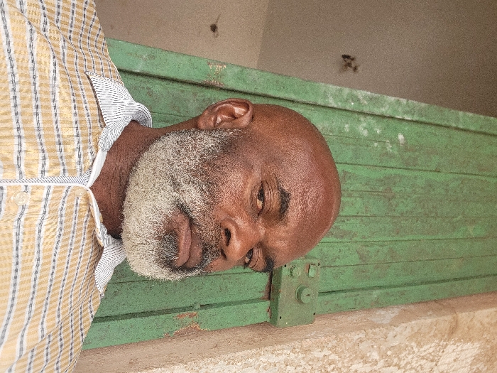 An adult male with dark skin, a bald head, and a full, light grey beard is depicted in a close-up portrait, looking directly at the camera. He wears a collared shirt with horizontal stripes in shades of yellow and dark blue, with a white and black vertically striped collar. The background features a weathered, vertical green wooden door or panel on the right and center, showing visible paint wear, with a green-painted metallic latch mechanism positioned to the right of the subject's head. To the left of the subject, a light-colored wall or doorway opening is visible, exhibiting a dark, irregular mark in the upper left. A rough, light brown wall section is present on the far right. The scene is located in the city of Maiburiji, Nigeria.