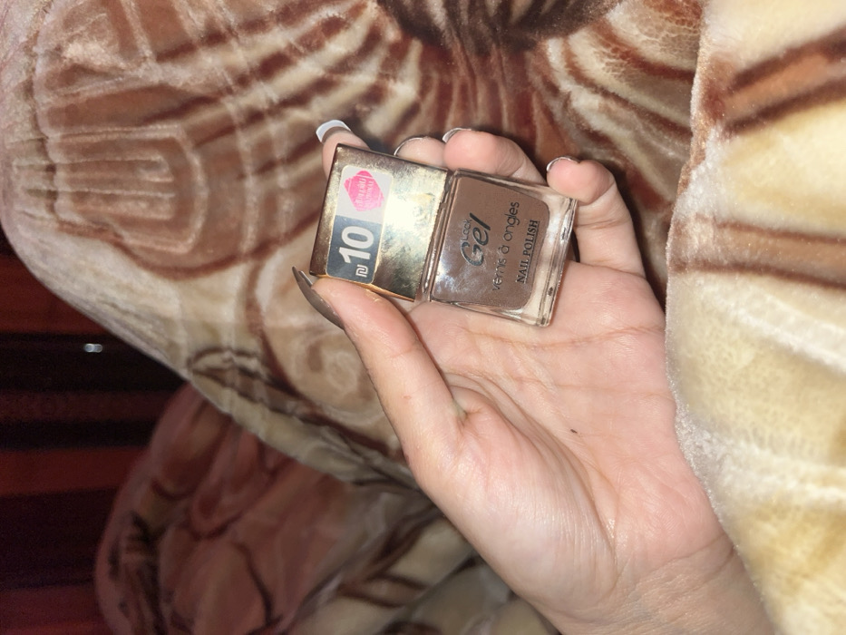 A hand holds a bottle of "Lady Luck Gel" nail polish, its lid flipped open. The polish is a shade of brown. A sticker on the lid indicates a price of 10 shekels. The hand is resting on a soft, brown and beige striped blanket. The person's nails are painted a color similar to the nail polish.