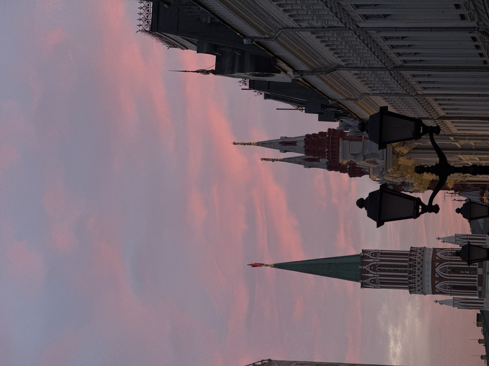 An exterior shot captures a twilight scene in Moscow, Russia, focusing on architectural elements under a pink and purple sky. The central subject on the left is the Borovitskaya Tower of the Moscow Kremlin, identifiable by its green conical spire topped with a luminous red five-pointed star. The tower features red brickwork with white architectural detailing, including arches and pilasters. To the right of the Borovitskaya Tower, multiple smaller spires and structures, likely also part of the Kremlin complex, are visible with red and gold accents. In the foreground on the right, a multi-story historic building features a dark, ornate mansard roof with intricate ironwork cresting, and a light-colored facade detailed with repetitive vertical elements and windows. Several dark, ornate, cast-iron street lamps are positioned in the mid-ground and foreground, partially obscuring the view of the buildings. The sky above is largely clear, exhibiting distinct bands of pink and purple clouds, indicative of sunset or sunrise. The viewpoint suggests a location on Mokhovaya Street or a nearby area, looking towards the Kremlin. No people or actions are discernible.
