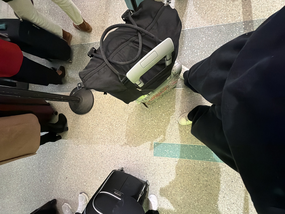 An overhead shot shows several people standing in a queue, likely at an airport, with suitcases and bags around them