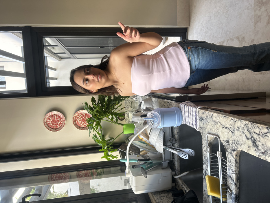 A young woman in a pink top and jeans stands beside a kitchen sink full of dishes. Decorative plates and a plant are on the wall beside a large window. The woman's left arm is raised with her index finger pointed upward. A dish drying rack with a sponge sits beside the sink. The kitchen counter has a marble pattern.