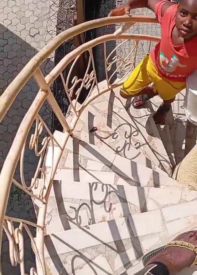 A young black child ascends a spiral staircase outdoors while carrying a white plastic bucket. The child is wearing an orange t-shirt with a Tik-Tok logo and yellow shorts, and sandals. The staircase is painted light yellow and has an ornate metal railing. The stairs are covered in white and light-grey tiles. An adult's feet can be seen at the bottom of the frame, wearing patterned sandals. The staircase is located outside a building with a light-yellow wall and a barbed wire fence nearby. The video appears to be taken from a position above the child on the stairs.