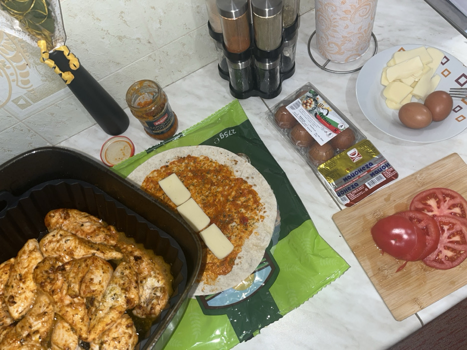 This image depicts a domestic kitchen countertop scene in Dragijevo, Bulgaria, focused on food preparation. A black, ridged grill pan in the upper left contains numerous pieces of cooked, seasoned chicken. Adjacent to the pan, a round tortilla lies atop a green plastic package (labeled "275g"), spread with a reddish, textured sauce and topped with three rectangular slices of light-colored cheese. To the right of the tortilla, an open glass jar of red sauce (possibly pesto or a pepper spread) with its red metal lid sits on the white tiled surface. Further right, a black utensil with gold accents is present. In the mid-right, a vertical spice rack holds several cylindrical clear jars with metal caps. Below the spice rack, a transparent plastic carton contains brown eggs, with a label indicating "ЯЙЦА" (eggs) and "БЪЛГАРИЯ" (Bulgaria). A small wooden cutting board in the lower-left displays a red tomato, partially sliced into three rounds. Next to the cutting board, a yellow package is labeled "МАЙОНЕЗА" (Mayonnaise). In the lower right, a white round plate holds two brown eggs and several irregular slices of light yellow cheese, with a fork resting on the plate. A roll of patterned paper towels on a stand is visible at the far right. The overall scene suggests an ongoing meal assembly.
