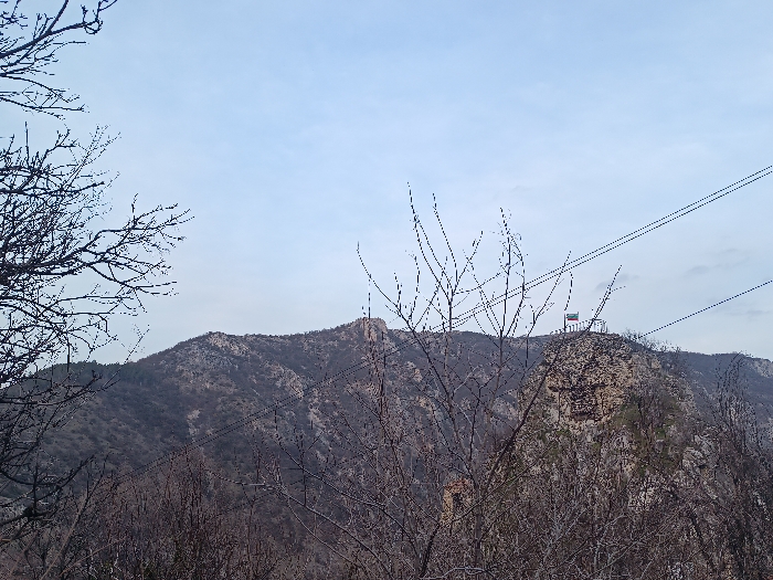 This image depicts a mountainous landscape in Lyaskovo, Bulgaria, under a light blue, partially clouded sky. The foreground is dominated by a dense cluster of bare deciduous tree branches, indicative of late autumn or winter. In the midground, a series of rocky and forested hills recedes towards the background. A prominent, rugged peak on the right features a structure atop it, displaying the Bulgarian national flag, characterized by horizontal stripes of white, green, and red. To the left of this peak, a higher mountain range with visible rock faces and sparse vegetation extends across the horizon. Two parallel lines, consistent with power lines or cables, traverse the upper right portion of the frame diagonally. No individuals or active subjects are present.