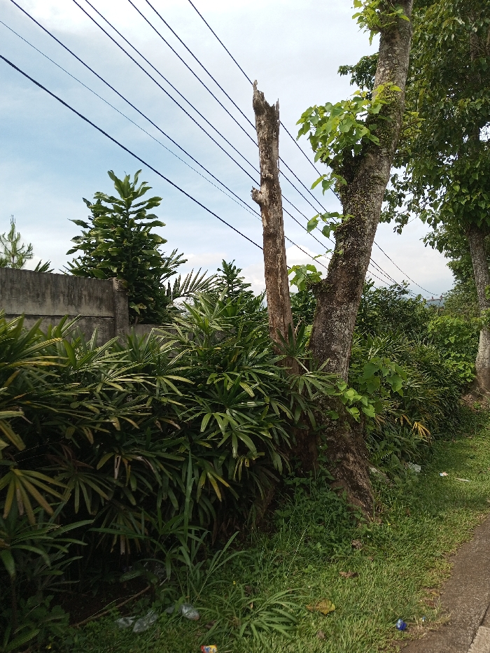 An outdoor scene in Kandenuwara, Sri Lanka, depicts a vegetated area adjacent to a paved surface under an overcast sky. Six to seven dark utility lines traverse horizontally across the upper portion of the frame. In the mid-ground, two prominent tree trunks stand: a weathered, broken tree stump on the left, and to its right, a living tree trunk exhibiting new green foliage sprouts and lichen growth. A dense row of shrubs with dark green, fan-like leaves occupies the mid-ground, extending from left to right. Behind these shrubs, a grey concrete wall is visible on the left, partially obscured by other green foliage. The foreground consists of green grass bordering a concrete edge or sidewalk. Scattered small pieces of litter, including plastic wrappers and bottle caps, are present on the grass. No human or animal subjects are visible.