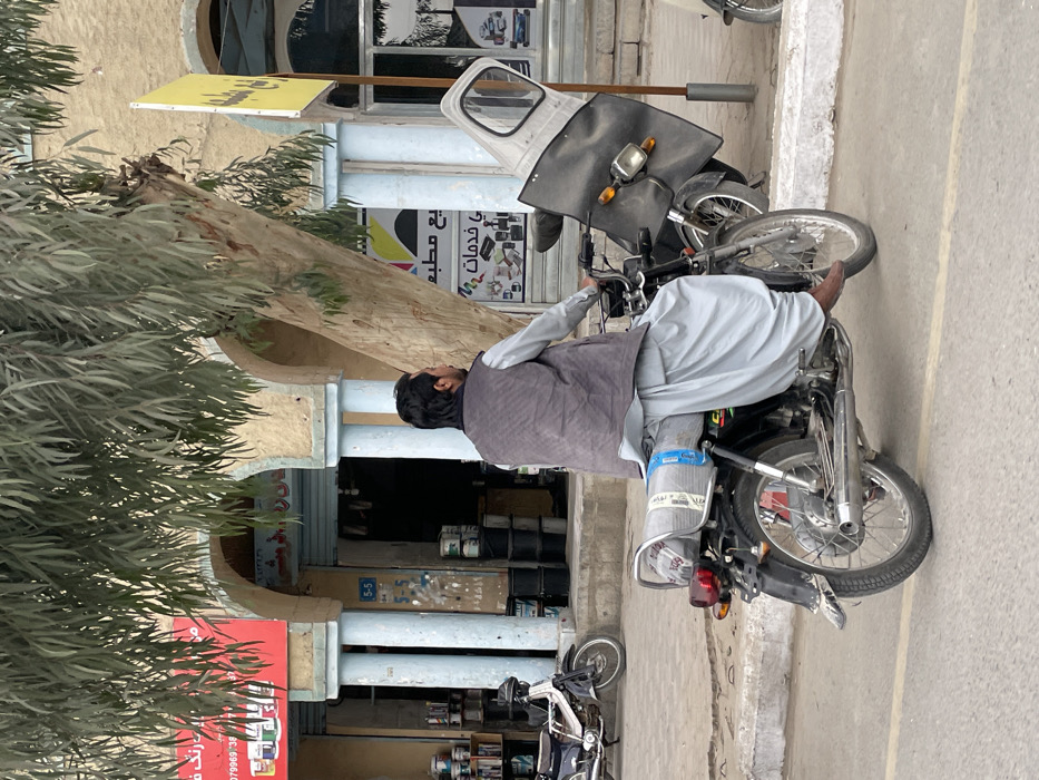 The image displays a street scene in Kandahar, Afghanistan. A male individual, viewed from the back-right, is seated on a black motorcycle on a paved road, facing away from the camera. He wears a light-colored shalwar kameez and a dark grey quilted vest; his bare feet are visible near the footpegs. A rolled, light-colored item, possibly a mat or blanket, secured with blue tape, is strapped to the rear seat of his motorcycle. To the right, a second motorcycle is parked, partially obscured by a large, light grey, soft fairing featuring a clear, window-like panel. In the midground, a prominent tree with light-colored bark and narrow green leaves stands between the road and the background structures. The background consists of multi-story buildings with tan-colored facades, featuring arched entrances supported by light blue columns. The building on the left displays a red sign with white Farsi/Dari script and a phone number (079969), with several paint cans visible near its entrance. The building on the right has a partial yellow vertical sign with Farsi/Dari script. Another white motorcycle is parked on the sidewalk to the far left. The environment suggests a commercial area.