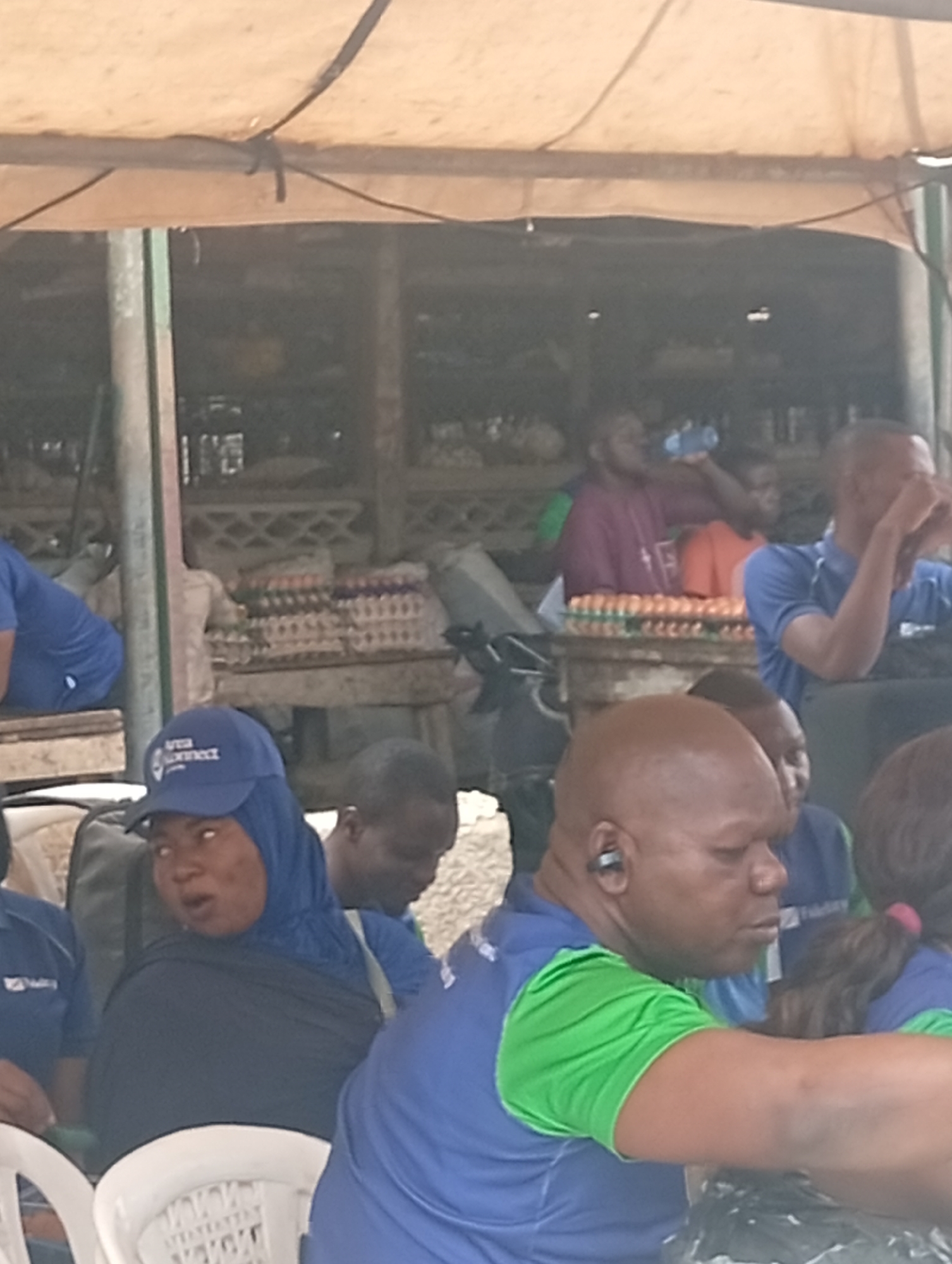group of people gathered in an outdoor market setting. Several individuals are wearing blue and green shirts, possibly uniforms, while one woman wears a blue headscarf and cap. In the background, there are displays of what appear to be eggs. People in the background appear to be drinking water or looking at something in the distance. The overall atmosphere seems casual and possibly communicative, suggesting a gathering or meeting in a public marketplace in Maiburiji, Nigeria.