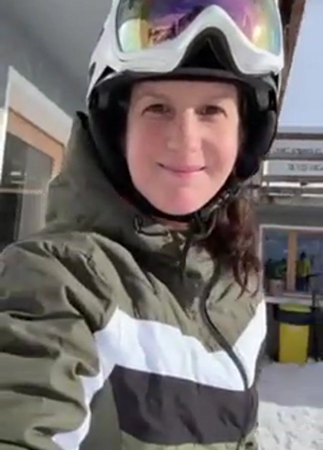 A woman wearing a green and white ski jacket, helmet, and goggles is standing in the snow on a sunny day. She is smiling at the camera and holding it at arm's length. Behind her, there is a snowy landscape with other people and ski lifts visible. The camera pans down to show a pair of skis standing in the snow. There is also a wooden table and a sign with colorful graphics. The overall impression is of a pleasant day at a ski resort.