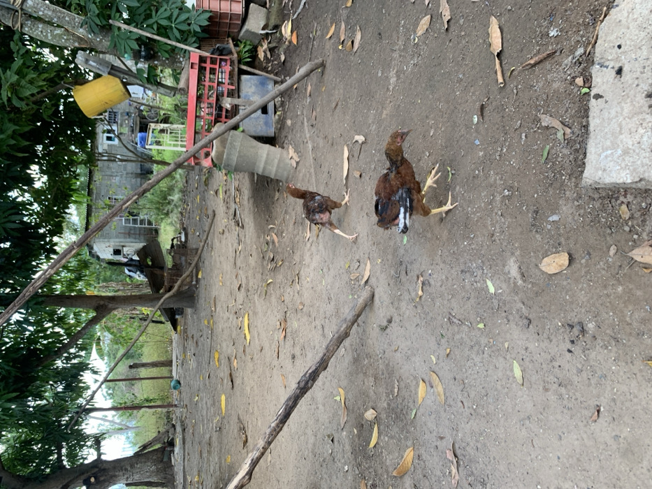 Two chickens stand on a dirt ground scattered with leaves and twigs. One chicken is brown and black, facing away with its legs splayed slightly. The other chicken is smaller and darker, facing towards the other one. In the background, trees surround a rural scene with a house partially visible behind some red crates, a yellow bucket, and other objects. Several long sticks are lying on the ground. A concrete block is visible in the upper right.
