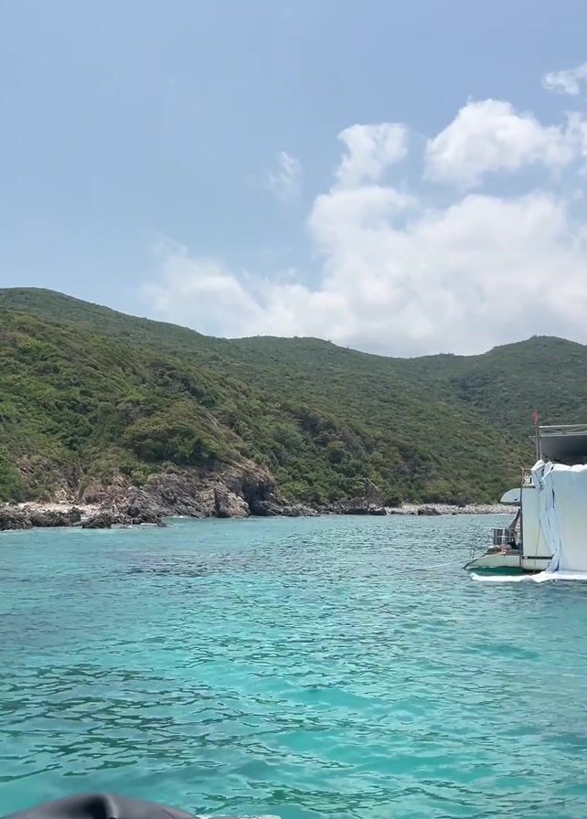boat moving towards a larger vessel in clear turquoise water. The vessel, named "Ocean World Crazy Party Hopping" is white with colored text. The background features lush green hills under a partly cloudy sky. The perspective is from a smaller boat, moving closer to the larger vessel.