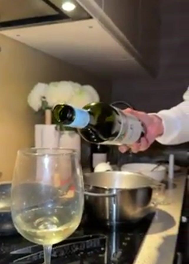 A woman in a white zip-up sweatshirt is standing in a kitchen and pouring white wine into a wine glass. The kitchen has brown cabinets, a black stove top, and white flowers in a vase on the counter. The woman tastes something off her finger, then smiles at the camera.