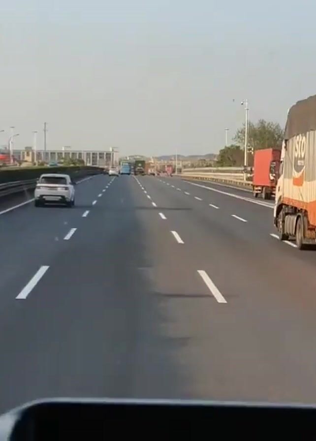 view from a vehicle driving on a multi-lane highway. The road is asphalt and has clearly marked white lane dividers. To the left, there is a white SUV in the closest lane. Further ahead, there are various vehicles including a bus and other cars. To the right of the camera vehicle is a large semi-trailer truck with the letters "STO" printed on the side. The sky is pale blue and clear, suggesting a bright day. In the background, there is a long, low building and some sparse vegetation. Overall, the scene depicts a typical highway drive.