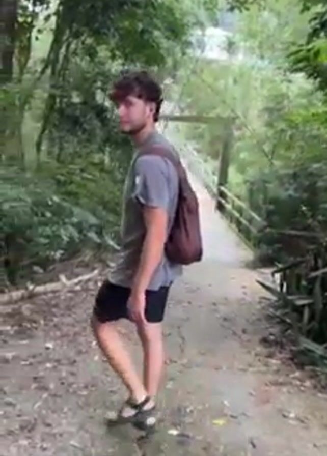 A young man walks down a slightly sloped dirt path towards a small bridge. He wears black shorts, a light-colored t-shirt, sandals, and a small brown backpack. The path is lined with green foliage on both sides. The man briefly looks over his shoulder. The bridge is made of concrete and has a simple railing. Beyond the bridge, some white buildings can be seen in the distance. The ground is covered with fallen leaves and dirt. The lighting suggests it is daytime and the sky is overcast.