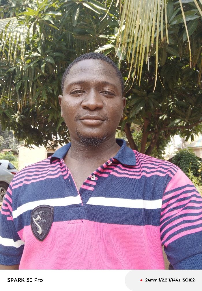 The image displays a head-and-torso portrait of an adult male in an outdoor, daylight setting. The man has a dark complexion, short black hair, and a stubble beard. He is wearing a polo shirt with a dark blue collar, a three-button placket, and a pattern of alternating thick pink and thin dark blue horizontal stripes, with a solid white horizontal stripe across the upper chest. A black, shield-shaped emblem featuring a silver 'S' and palm tree design is affixed to the left chest area of the shirt. In the background, to the subject's left, a portion of a white vehicle is visible, along with a light-colored building structure situated on what appears to be an elevated, unpaved area. To the subject's right and extending behind him, lush green foliage from multiple trees and shrubs forms the backdrop, with prominent palm fronds visible in the upper right quadrant of the image. The environment suggests a vegetated, possibly semi-urban or residential area. While the city of Akwanga, Nigeria, is specified, no specific landmarks or identifying features are discernible within the image to pinpoint an exact location within the city.