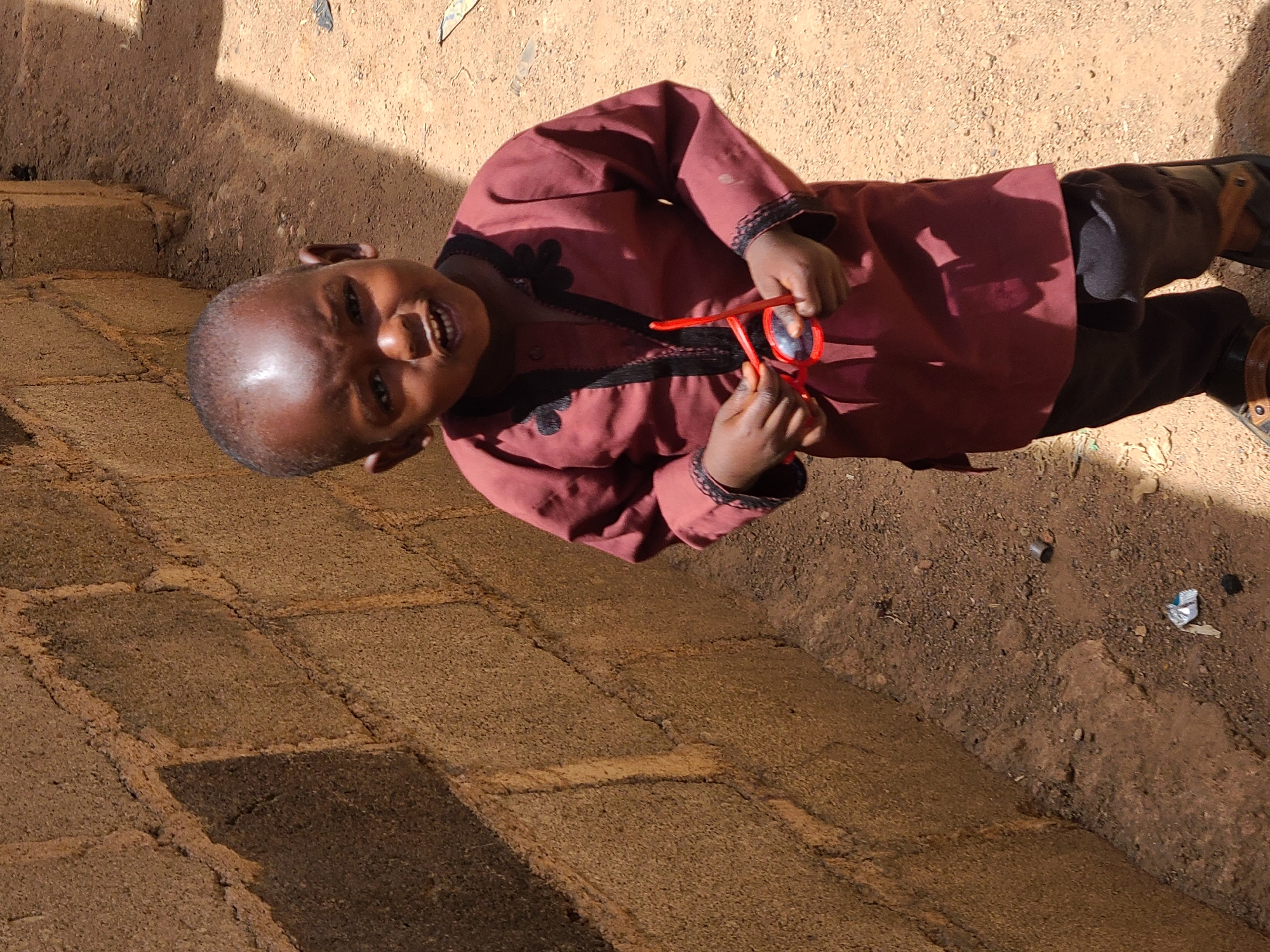 A young child, likely male, with dark skin and a shaved head, stands on a light brown dirt path in what appears to be a residential area of Jos, Nigeria. The child wears a maroon long-sleeved tunic featuring black embroidered trim on the V-neck and cuffs, along with dark trousers and dark open-toed sandals with brown straps. He holds a pair of red-framed sunglasses with dark lenses in both hands, positioned at chest height. His mouth is slightly open, revealing upper teeth, and he looks directly at the camera. To the child's left is an unplastered wall constructed from light brown, rough-textured blocks, displaying visible mortar lines and diagonal shadows. The unpaved ground consists of dirt and small gravel, with scattered debris including a crumpled silver object, a small dark object, and a metallic can fragment. The scene is illuminated by direct sunlight, casting defined shadows.