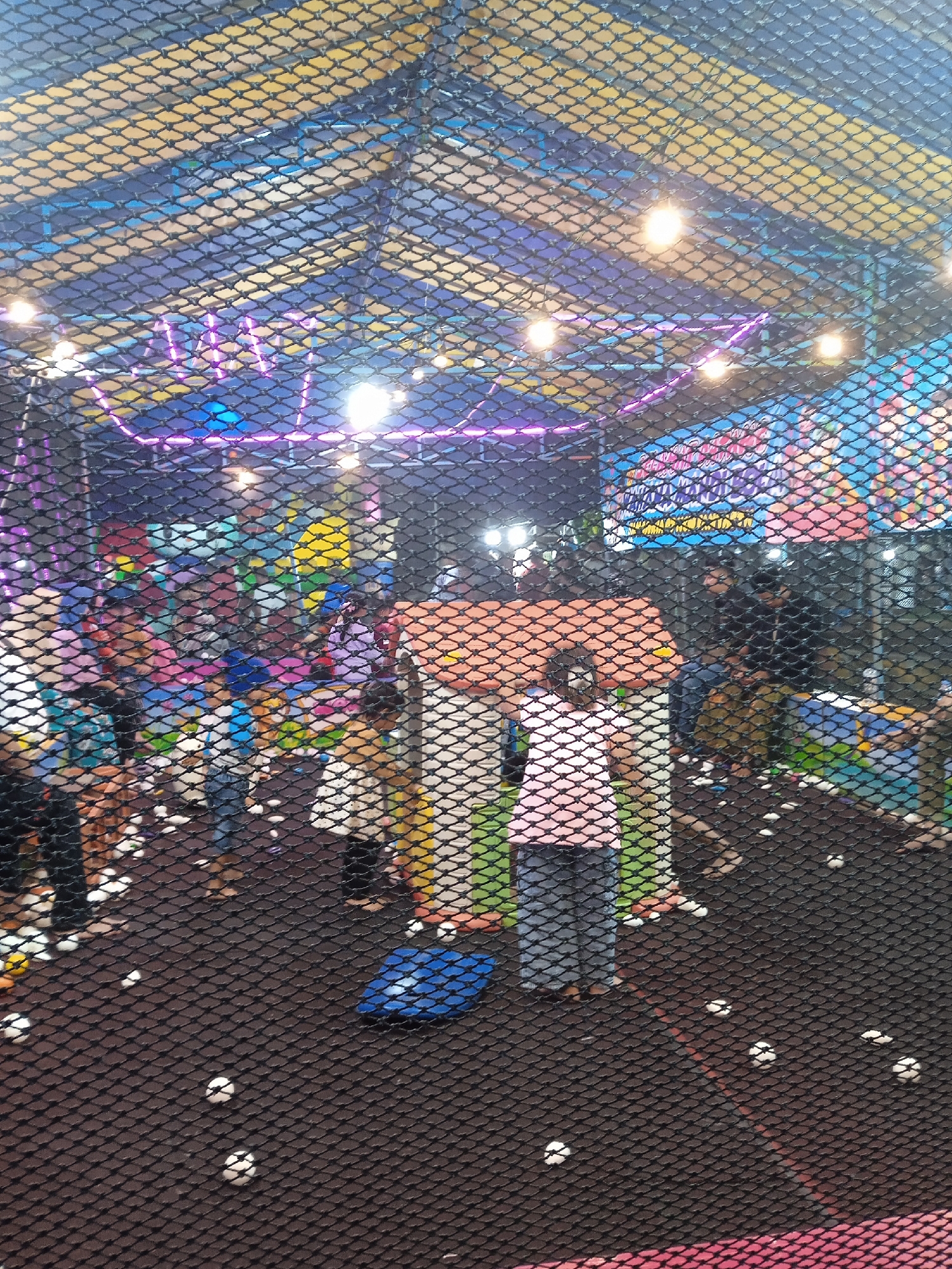 A net obscures the view of an indoor playground in Kaliwungu, Indonesia