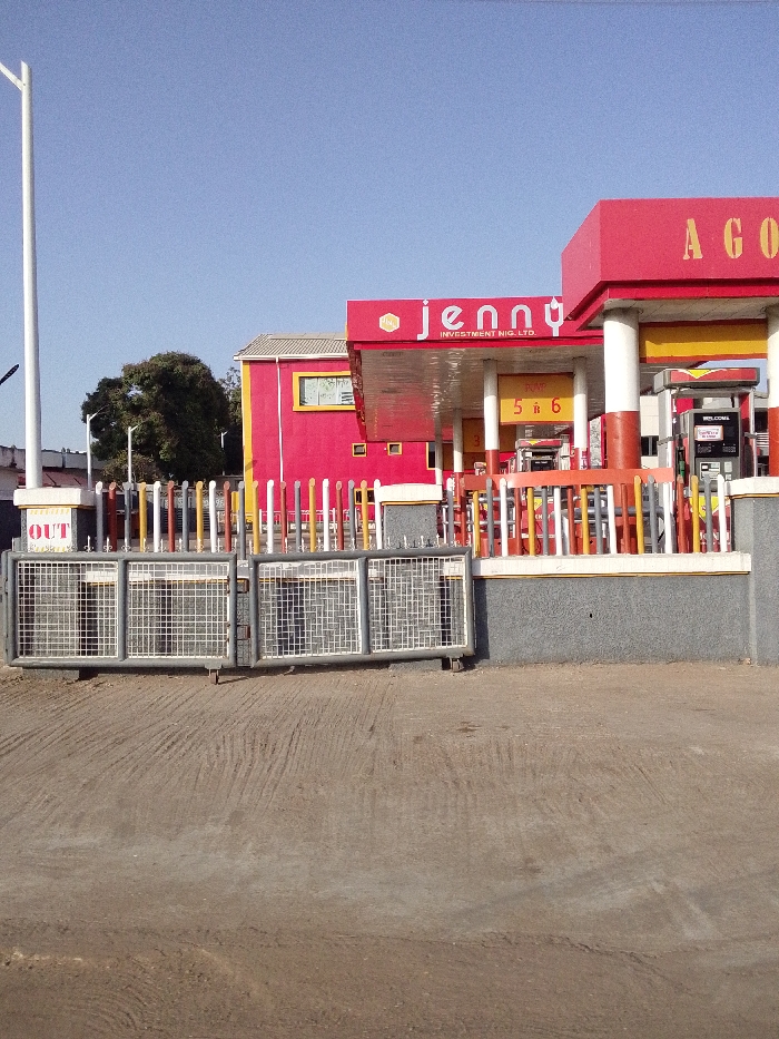 A Jenny Investment Nig. Ltd. gas station features a vibrant red and yellow color scheme. The station is partially enclosed by a low grey and white fence. A grey metal gate with an "OUT" sign is at the entrance. The ground is paved and visibly worn. A utility pole stands tall in the background against a clear blue sky. The gas station's pumps are visible under the canopy.