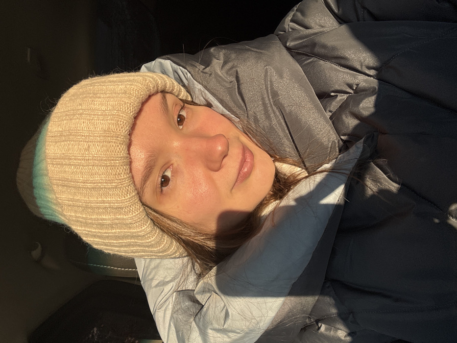 The specific location within the city of Sosnovoborsk, Russia, cannot be determined from the image, which depicts an interior scene. The image shows a young female individual from the chest up, positioned inside what appears to be a vehicle, with a dark interior and a headrest visible in the background. She has light skin, brown eyes, and light brown hair partially visible under a light beige ribbed knit beanie. She is wearing a grey puffer jacket with a light blue or silver-colored lining visible around the collar, and a white garment underneath. Strong, warm sunlight illuminates the right side of her face (viewer's left), casting shadows across her jacket and the left side of her face. She is looking directly at the camera with a slight, closed-mouth smile.