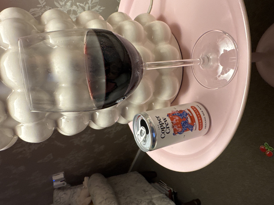 The image captures an indoor setting within a residence in Babergh, United Kingdom. The primary focus is a wine glass containing dark red wine, approximately half full, positioned on a round, light pink side table or tray. Adjacent to the wine glass is an opened aluminum can, labeled "The Copper Crew Negroamaro Organic Red Wine," also resting on the pink surface. A prominent white, multi-lobed ceramic lamp or decorative object occupies the background behind the glass and can. To the far left, a portion of a light-colored upholstered armchair is visible against a patterned brown wall. A white electrical cable extends from behind the lamp across the pink surface. On the dark carpet in the lower-left foreground, a small red cherry-shaped decorative object is present. No individuals are depicted in the scene.