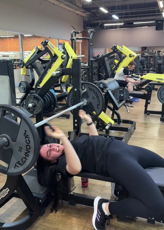 A woman is lying on a bench press machine in a gym with a barbell resting on her chest