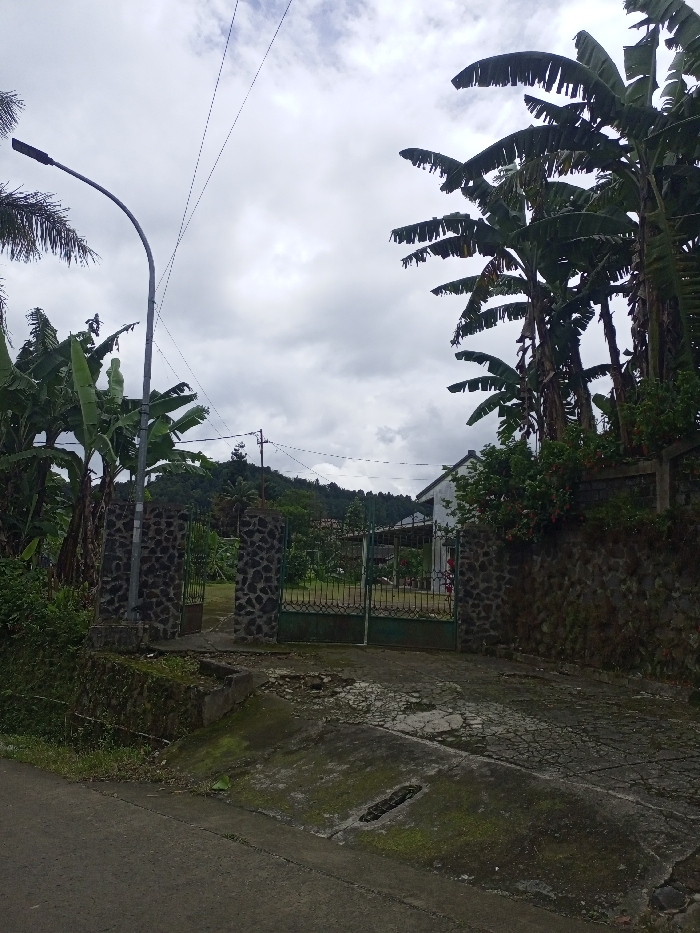 The image displays an exterior scene in Meyong, India, under an overcast sky. A cracked and moss-covered concrete driveway or entrance area occupies the foreground, featuring a rectangular drainage grate on its right side. A two-panel, dark green wrought-iron style gate, partially open, stands in the midground, flanked by two pillars constructed from irregular dark stones. To the right of the gate, a matching stone wall extends, topped with green bushes and red-flowering plants. To the left, a grey street lamp post with a curved arm and dark fixture rises. Multiple thin utility wires traverse the upper half of the frame. Beyond the gate, a white building with a dark roof is partially visible on the right. The property grounds appear vegetated, leading towards a densely tree-covered hill or mountain in the background. Numerous tall banana trees with large green leaves are prominent on both sides of the frame. No individuals are present.
