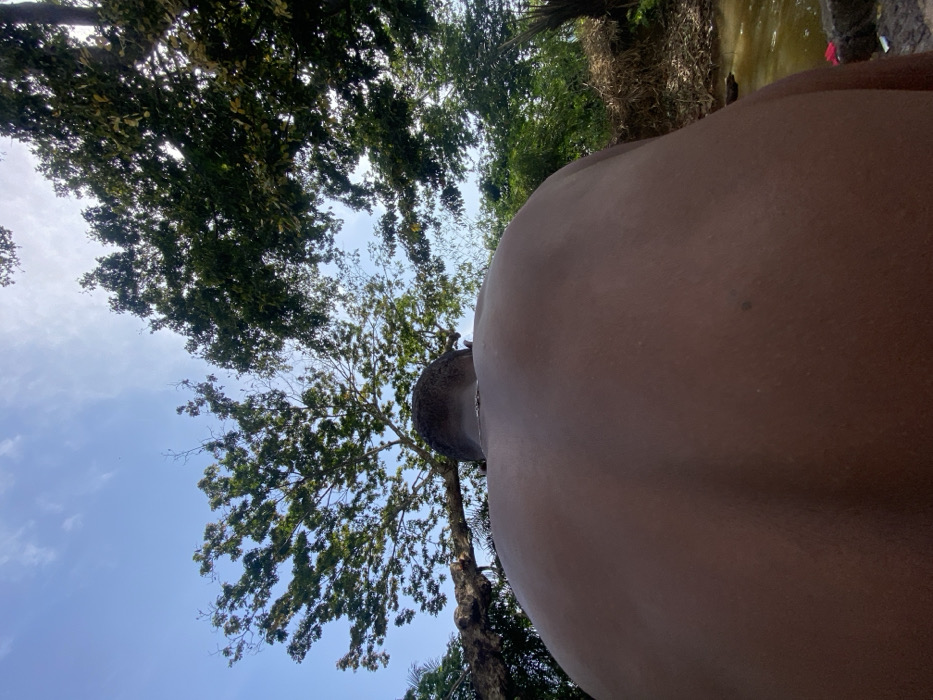 The scene depicts the upper back and head of an individual with dark skin, viewed from a low angle, facing away from the camera. A thin, silver-colored chain is visible around the neck. The individual's back is bare. In the background, a clear blue sky with sparse white clouds is visible above a canopy of dense green foliage from multiple trees. To the lower right, a body of brownish-yellow water, consistent with a river or stream, is present, with some dark ground and dried brush on its immediate bank. The environment is outdoors, characterized by natural vegetation and water. This scene is located in Ufueseni, Nigeria.